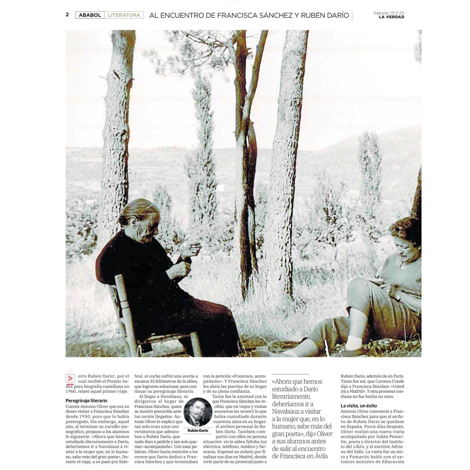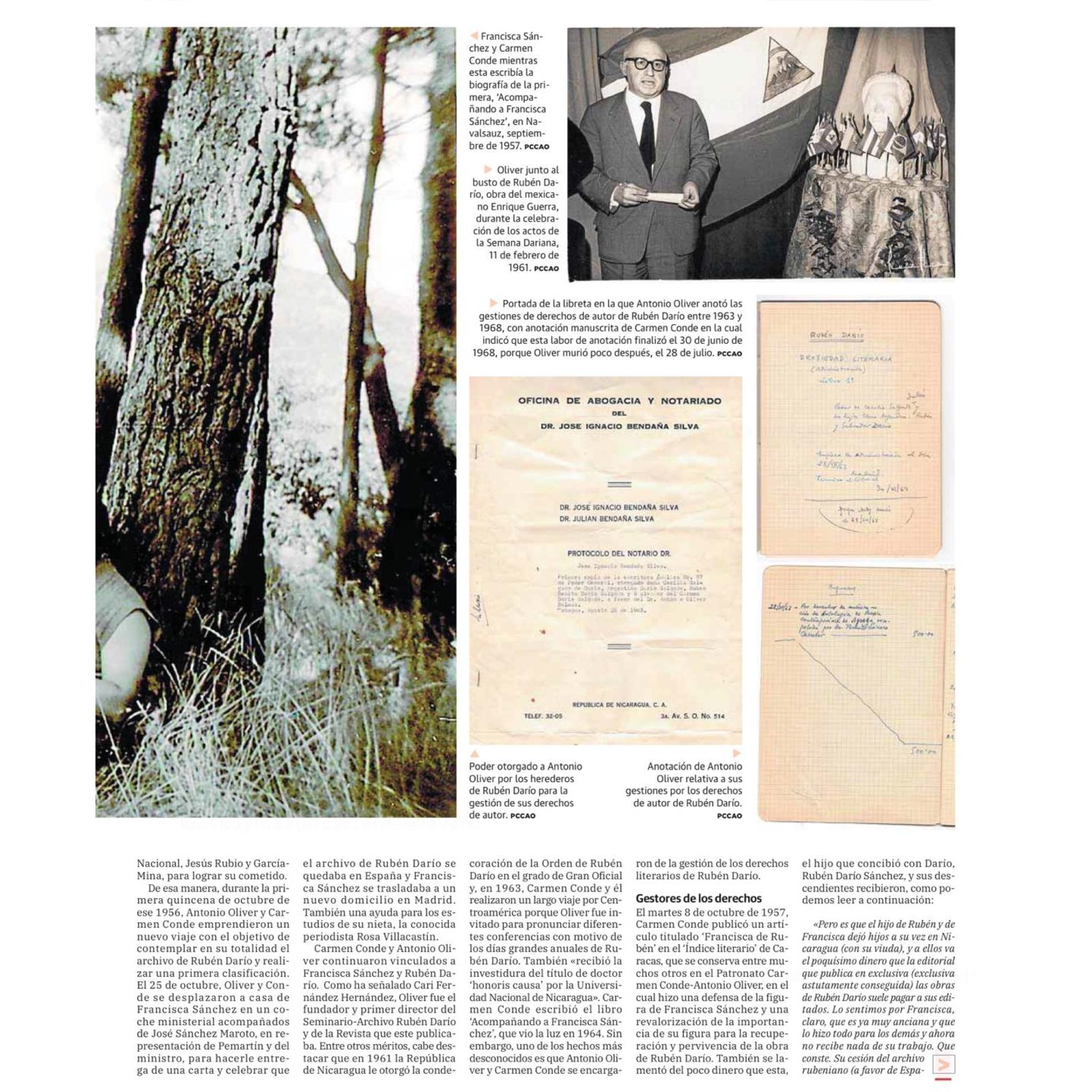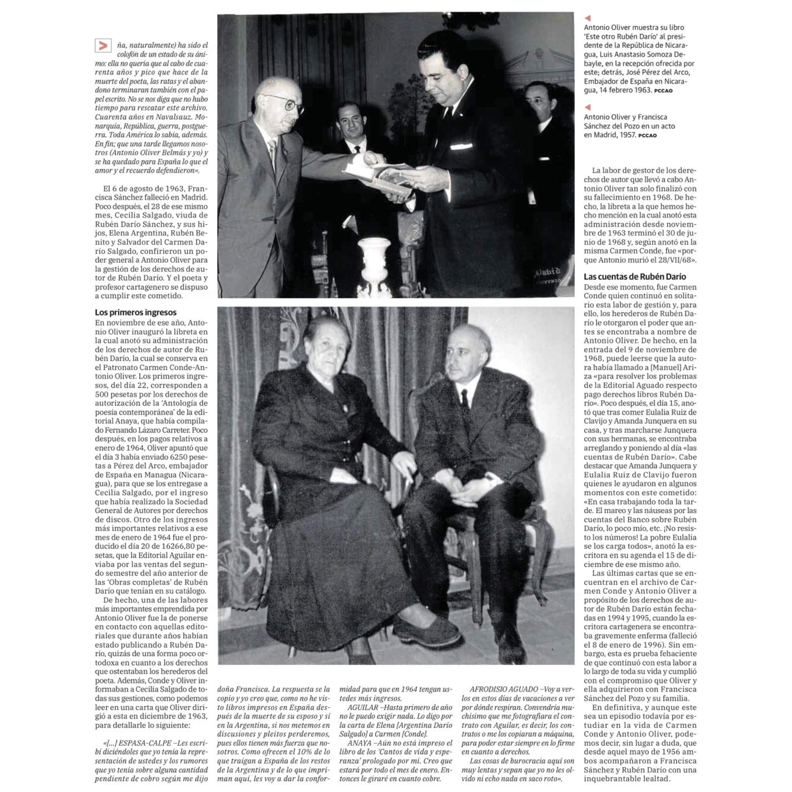 El sábado 15 de noviembre de 2025, en Ababol. Semanario de las Artes, las Letras y las Ciencias de La Verdad de Murcia, apareció el artículo de Fran Garcerá sobre la labor desconocida de Carmen Conde y Antonio Oliver como gestores de los derechos de autor de Rubén Darío. Este hecho ocurrió tras conocer a la última pareja sentimental del escritor nicaragüense, Francisca Sánchez del Pozo y su familia, con quienes siempre les unió un entrañable cariño. Esta labor continuó tras la muerte de Antonio Oliver en 1968 a través de Carmen Conde hasta prácticamente el momento de su fallecimiento en 1996.